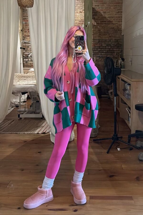 The top’s tiered ruffles and patchwork prints add dimension and depth, well paired with the chunky cardigan in pink for added comfort. It’s completed with those pink sneakers to bring some fun and unexpectedness.